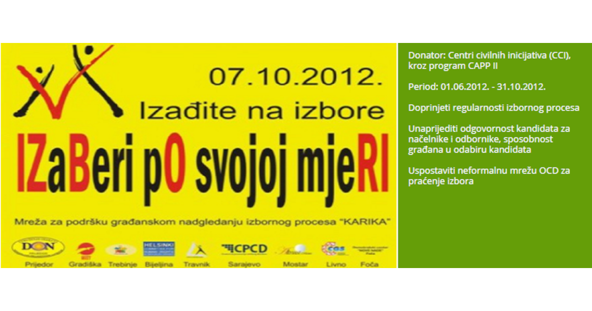 Cilj projekta je bio povratiti povjerenje građana u izborni proces i unaprijediti njihovu sposobnost da izaberu najbolje kandidate za predstavnike lokalnih vlasti na osnovu njihovih predizbornih aktivnosti i obećanja. Projekat se realizirao u 10 općina/opština u Bosni i Hercegovini.